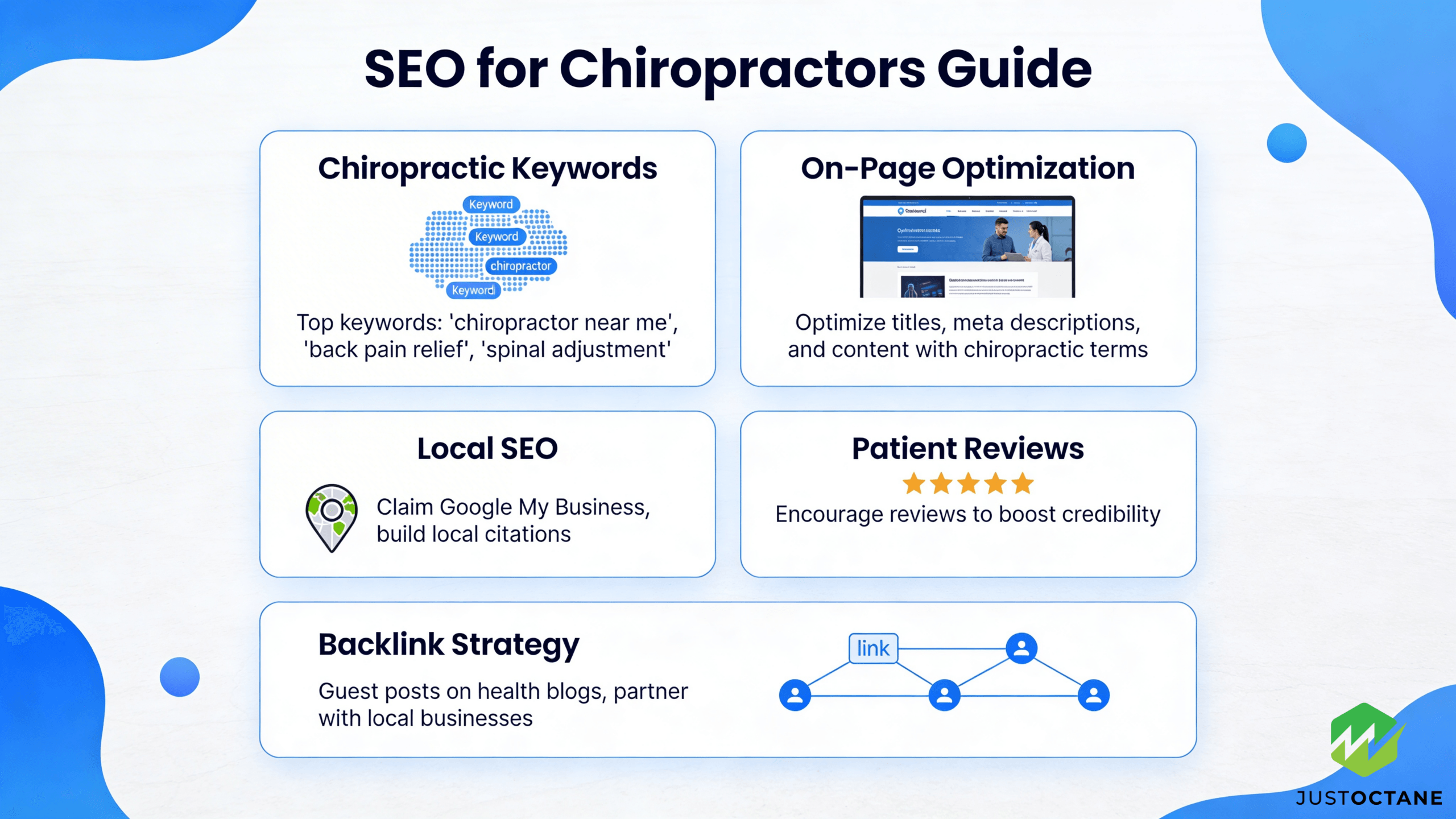 If you want a done-for-you plan, JustOctane is an SEO company that builds chiropractic SEO strategy roadmaps, implements technical fixes, and runs ongoing content and local SEO campaigns designed to produce measurable rankings, traffic, and leads.