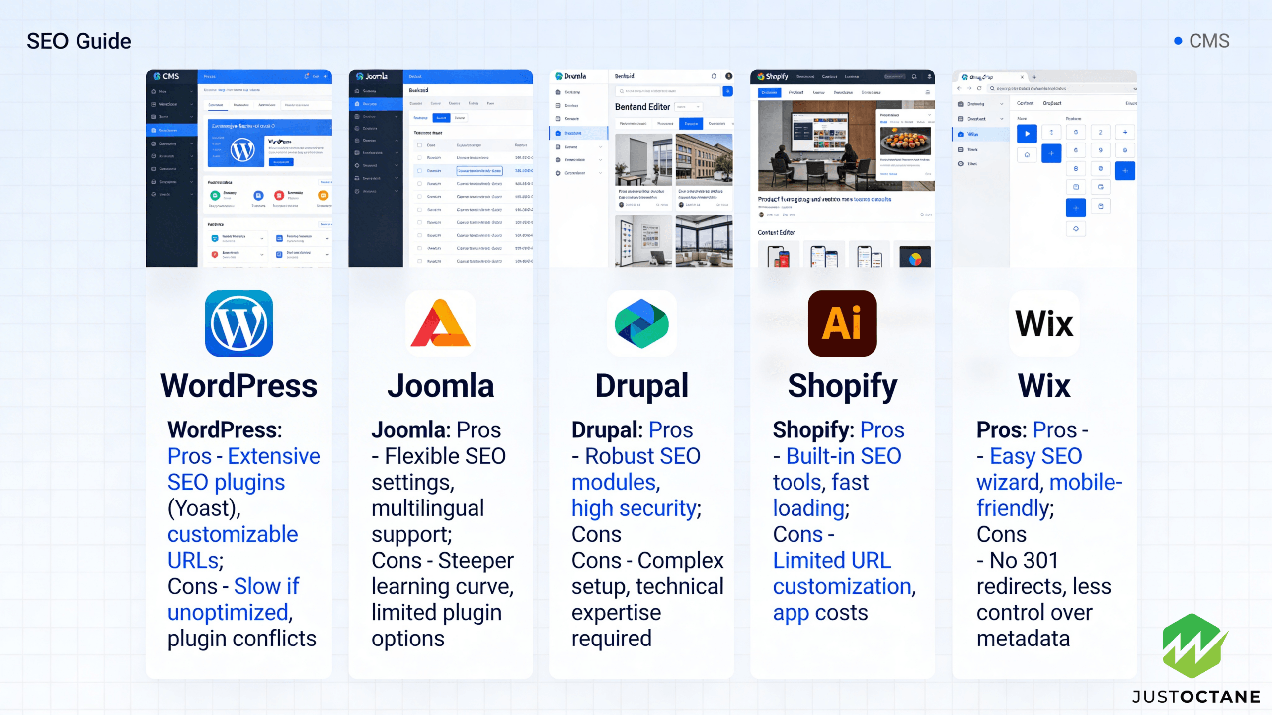 Choosing a CMS (content management system) is a long-term platform decision that affects SEO, content operations, and how quickly your team can ship pages that satisfy users and search engines. Use your data to make the call with confidence—this guide distills patterns we see across top ranking websites and shows how JustOctane helps businesses turn a CMS choice into business growth.
